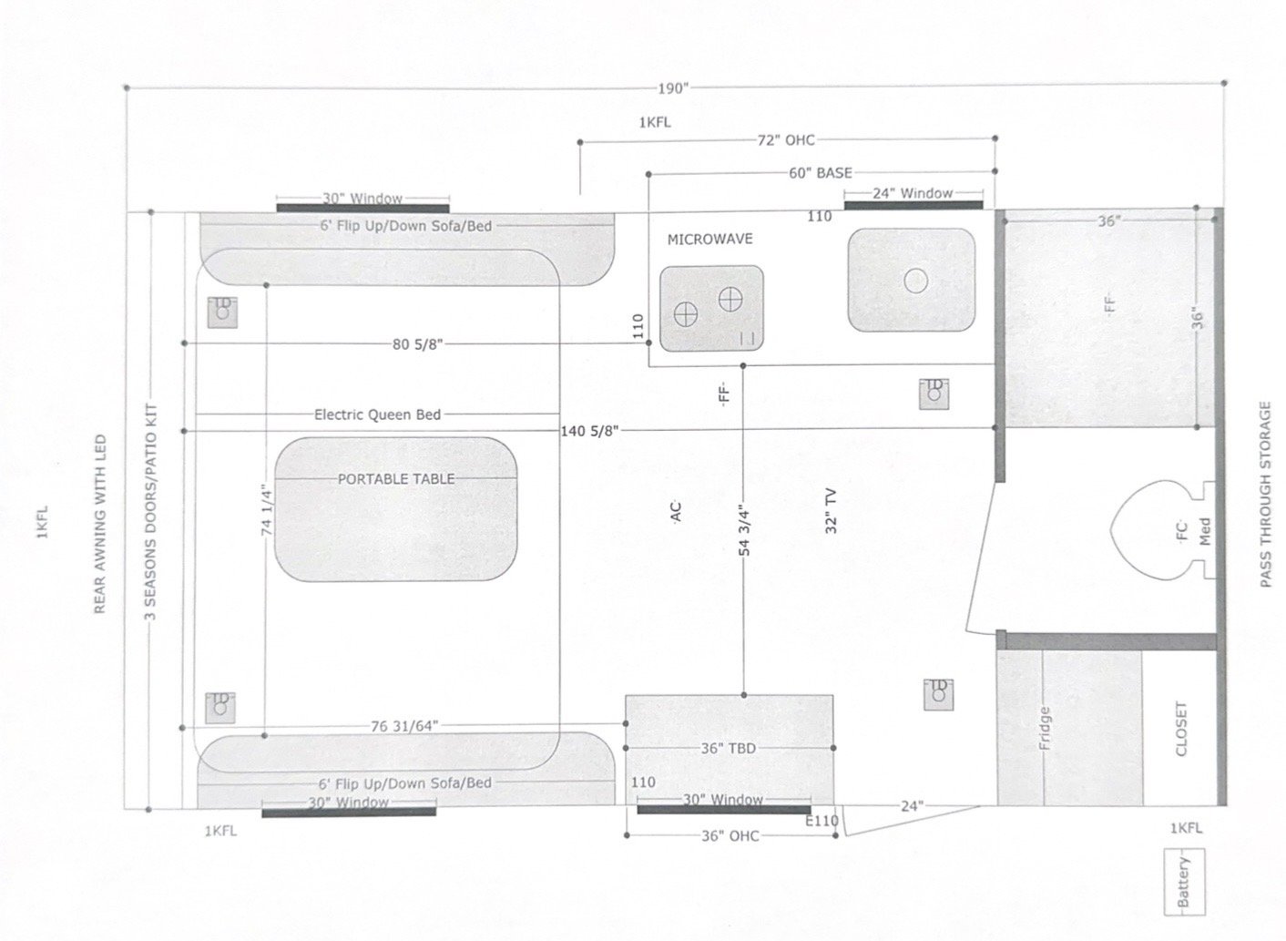 We are so happy we upgraded the patio with patio gates and added 3-season doors. The perfect addition to this small trailer, we just gained 8’. We decided on an awning over the patio and on the side of the trailer, where Dennis can work on the bikes. With that in mind, we customised a built-in toolbox. We chose to flip the axles, putting them on top of the leaf springs. With that, it increased ground clearance and gave us more floor space; we won’t have the wheel wells inside. We went with the smooth fiberglass finish, outdoor shower, and 2 automatic awnings.