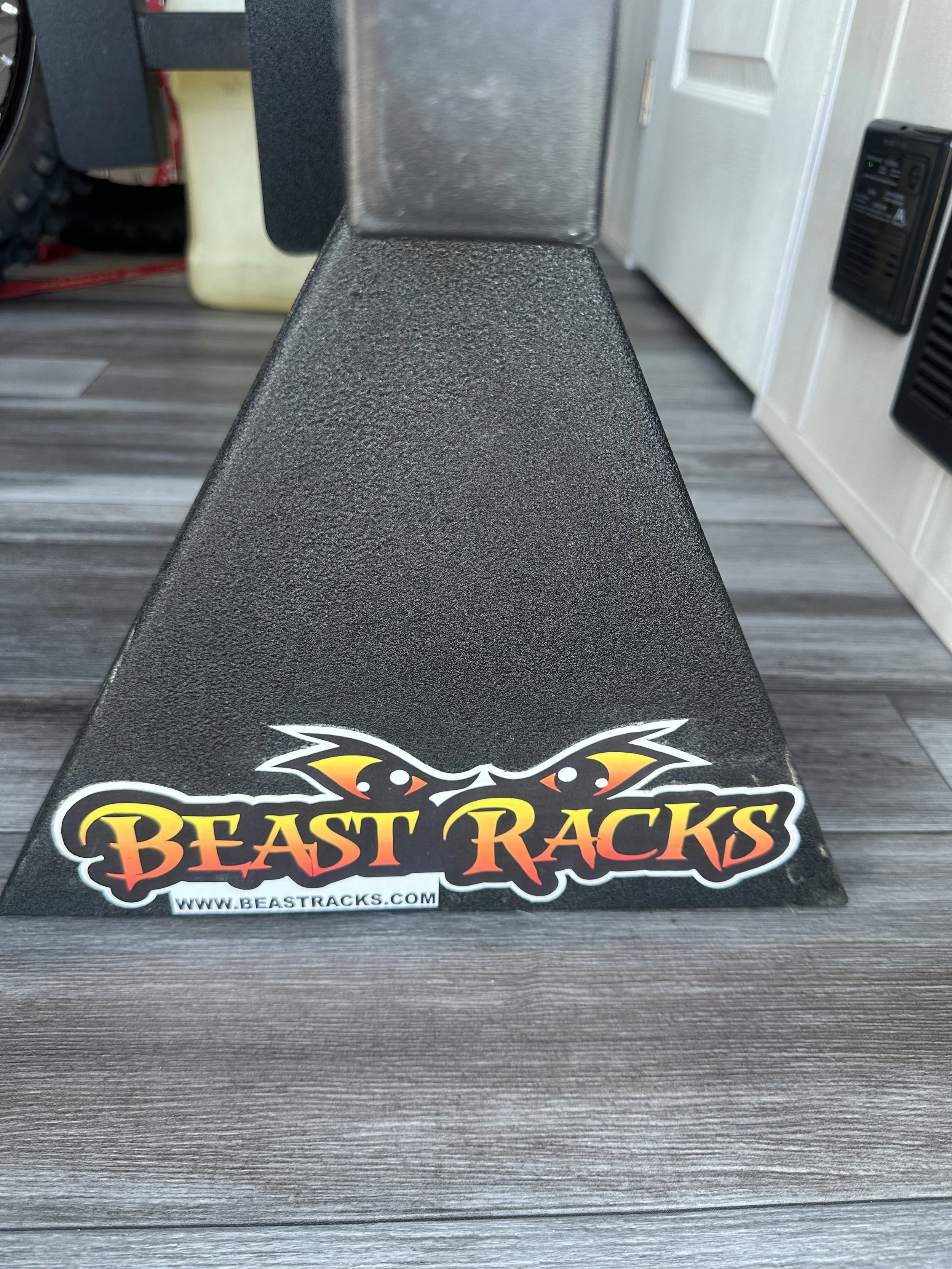 After a ton of research, we found Beast Racks. Beast Racks is a customized dirt bike rack that will attach to the anchors we have built into the trailer. From there, we slide the front tire of the dirt bike into the rack securely and tie it down.